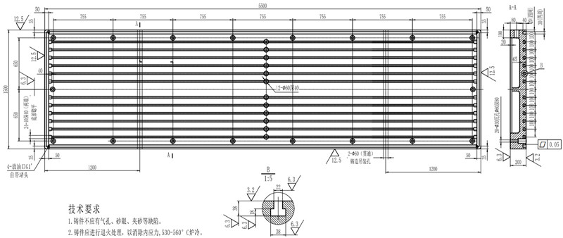 5.7鑄鐵平臺(tái) 鑄鐵平臺(tái)的作用就是安裝于臺(tái)架上的發(fā)動(dòng)機(jī)、測功機(jī)及聯(lián)軸節(jié)等部件為一體,確保正確的位置精度。且整體安裝于吸震基礎(chǔ)上,使臺(tái)架更加合理。鑄鐵平臺(tái)上平面有T形槽。鑄鐵平臺(tái)長5500,寬1500,高200mm。