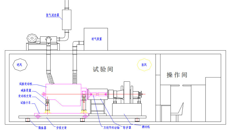 5.8.4箱體的吸隔音 箱體吸隔音采用在箱體內(nèi)側(cè)墻面、頂面安裝吸隔音材料,對(duì)門、窗進(jìn)行隔音處理。吸音和隔音墻壁要求在發(fā)動(dòng)機(jī)運(yùn)轉(zhuǎn)的所有工況下,測試間外1.5m處噪聲均不得超過85分貝,監(jiān)控室內(nèi)噪聲不超過75分貝。 墻體和頂面的隔音:箱體內(nèi)墻面及頂面吸聲板采用穿孔吸聲板,厚度為2mm,孔徑為5mm,穿孔率>30%,板材采用2mm鍍鋅板穿孔后表面噴塑處理,為增加箱體的隔聲量,在吸聲面板與外蒙皮板之間設(shè)置一道吸隔聲塊體,在隔聲層與內(nèi)蒙皮板間填充吸聲吸音材料,壁厚50mm,容重24kg/m³,吸聲系數(shù)為0.9,在吸聲材料和內(nèi)蒙皮板間鋪設(shè)織物層,防止礦棉超細(xì)纖維逸出,在箱體開口、開窗、開孔和所有管道開口處均采取密封處理。 隔聲觀察窗:監(jiān)控室和試驗(yàn)間之間采用可拆卸組合式雙層玻璃防火隔音窗,玻璃厚度≥8mm,隔聲量≥35分貝,觀察窗寬度1.4m,高度1.2m,安裝高度離地面0.9m,觀察清晰,無重影,窗框選用優(yōu)質(zhì)型鋼制作,表面作防銹油漆處理,內(nèi)腔采用鋁合金板加吸聲材料,并加填干燥劑,保證隔聲窗腔內(nèi)干燥,在濕度大的環(huán)境下不結(jié)霧,玻璃應(yīng)有足夠強(qiáng)度承受可能的零件飛出敲擊力,破裂時(shí)玻璃無銳角。 物流隔聲門:箱體前端正中位置設(shè)對(duì)開隔聲門,門寬度為1.8m,高度為2.4m,門正面為2mm鋼板,門反面為微孔板,隔聲門內(nèi)腔填充吸聲材料,門周邊采用硅橡膠成型密封材料,填充間隙隔絕漏聲。 手動(dòng)隔聲門:發(fā)動(dòng)機(jī)試驗(yàn)間和控制間之間的隔墻設(shè)單扇側(cè)開吸隔聲門,門凈寬為0.9m,高度為2.1m,門框采用型鋼制作,門正面采用2mm厚優(yōu)質(zhì)冷軋板,做亞光噴漆處理,門反面為1mm厚穿孔鋼板,表面噴塑處理,內(nèi)腔填充吸聲離心棉,并鋪設(shè)織物層,防止礦棉超細(xì)纖維逸出沾染皮膚,門周邊采用成型硅橡膠密封條,保證密封劑隔聲,門與門框間采用鋼質(zhì)鉸鏈,采用手動(dòng)開啟方式,門鎖采用專用門鎖控制,符合消防逃生鎖要求,推壓即開型鎖結(jié)構(gòu)。 5.8.5、控制間 臺(tái)架監(jiān)控室長度為2.10米,使用輕質(zhì)隔墻板和阻燃材料裝修,頂部吊頂,地面配防靜電地板,高度與試驗(yàn)臺(tái)架間地板平齊,監(jiān)控室預(yù)留配置掛壁空調(diào)的供電插座、冷凝水出口、室內(nèi)外機(jī)連接管路通道。 5.8.6照明電控系統(tǒng) 測試間內(nèi)頂面兩側(cè)設(shè)6盞防爆LED燈,監(jiān)控室內(nèi)頂面上設(shè)2盞防爆LED燈,照度均為500±50 lx。 測試間和監(jiān)控室各裝一個(gè)應(yīng)急照明燈,供突然斷電或緊急狀況時(shí)使用。 箱體控制間設(shè)獨(dú)立嵌入式動(dòng)力配電箱,配電箱內(nèi)對(duì)電動(dòng)行車、照明電源、380插座、220插座等單獨(dú)分路控制。 在測試間靠近隔音門的墻壁上安裝照明系統(tǒng)開關(guān)等。因測試間內(nèi)空氣中油成份較濃,為了保證安全,測試間內(nèi)的所有開關(guān)插座、電器應(yīng)作防水防爆處理。 集裝箱內(nèi)照明及其他電控系統(tǒng)需遠(yuǎn)離發(fā)動(dòng)機(jī)和臺(tái)架排氣管等高熱源部位。 控制間墻面觀察窗下設(shè)置3個(gè)電源插座,每個(gè)布置3/2孔220V,10A插座,預(yù)留試驗(yàn)間到控制間的電纜線槽接口。 所有照明、插座、開關(guān)選用符合國家相關(guān)標(biāo)準(zhǔn)規(guī)定的產(chǎn)品。 5.8.7葫蘆軌道 在試驗(yàn)臺(tái)上方設(shè)置單軌葫蘆軌道(20#工字鋼),承載能力2T,軌道伸出屋外。并配齊掛線導(dǎo)軌及線夾。 5.8.8試驗(yàn)室地板 測試間地面除安裝基座外,所有空間均需鋪設(shè)防滑鋁合金地板,要求結(jié)構(gòu)美觀,具有阻燃、防腐、防銹、環(huán)保、輕便、承載力強(qiáng)等功能。 地板支架采用型鋼制作,結(jié)構(gòu)強(qiáng)度滿足承載要求,支架安裝采用可拆卸結(jié)構(gòu),便于地坑內(nèi)設(shè)備及管線的維護(hù)。 監(jiān)控室地面采用防靜電地板。 5.8.9試驗(yàn)室送、排風(fēng)系統(tǒng) 通風(fēng)系統(tǒng)采用下送上抽的送風(fēng)方式,布置方式設(shè)計(jì)需考慮試驗(yàn)間內(nèi)充分的熱循環(huán),避免試驗(yàn)間內(nèi)過熱,系統(tǒng)主要由風(fēng)機(jī)、減振器、風(fēng)管、風(fēng)管支承架、手動(dòng)調(diào)節(jié)風(fēng)口、防火閥、消聲靜壓箱、防塵帽等組成,用于將發(fā)動(dòng)機(jī)工作過程中產(chǎn)生的余熱排出,保證箱內(nèi)溫度相對(duì)外界環(huán)境溫度,溫升不超過15℃,將泄漏的發(fā)動(dòng)機(jī)廢氣及時(shí)排出房外。 通風(fēng)系統(tǒng)部件安裝施工滿足《通風(fēng)與空調(diào)工程施工及驗(yàn)收規(guī)范》、國標(biāo)《GB50243-2002》、《全國通用通風(fēng)管道配件圖》等國家規(guī)范。 選擇送風(fēng)機(jī)風(fēng)量為45000m³/h,排風(fēng)機(jī)風(fēng)量為45000m³/h,通過調(diào)節(jié)裝置使室內(nèi)保持微負(fù)壓約5mm水柱。 風(fēng)機(jī)底座安裝于箱體頂部,匹配高性能減振器,最大振幅≤0.1mm,風(fēng)機(jī)安裝采用可拆卸結(jié)構(gòu)。 進(jìn)風(fēng)風(fēng)機(jī)前端和排風(fēng)風(fēng)機(jī)后端均設(shè)消聲靜壓箱,室內(nèi)風(fēng)口安置可調(diào)風(fēng)向鋁合金百葉風(fēng)口。 進(jìn)排風(fēng)管路和箱體送排風(fēng)管與箱體結(jié)