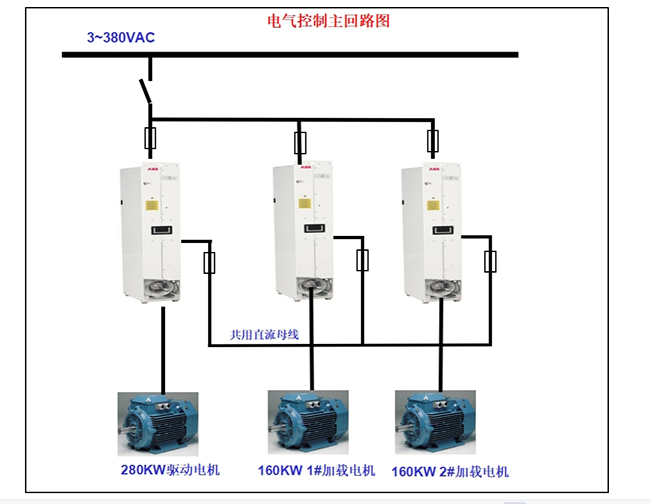 一臺(tái)變頻器(驅(qū)動(dòng)變頻器)控制驅(qū)動(dòng)電機(jī)運(yùn)行轉(zhuǎn)動(dòng),通過(guò)聯(lián)軸器(減速機(jī))帶動(dòng)加載電機(jī)轉(zhuǎn)動(dòng)。通過(guò)另二臺(tái)變頻器(加載變頻器)的控制,使加載電機(jī)處于力矩加載發(fā)電狀態(tài),其發(fā)出的電能經(jīng)加載ABB變頻器的IGBT整流單元,輸出直流電,直接與驅(qū)動(dòng)變頻器的直流母線連接,經(jīng)逆變后轉(zhuǎn)換成三相交流電供給驅(qū)動(dòng)電機(jī)。使整個(gè)系統(tǒng)的電能形成一個(gè)內(nèi)部交流循環(huán),從而達(dá)到節(jié)能目的。